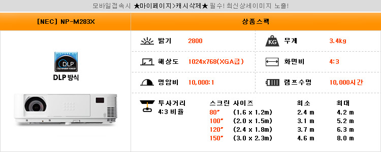 [NEC] NP-M283X DLP / XGA급 / USB뷰어 / 빔프로젝트, 빔프로젝터