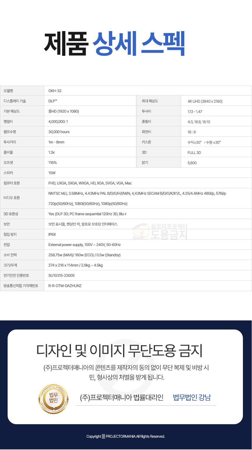 화면사양 밝기 5600안시 / FULL HD (1920x1080) / 16 : 9 / 동적명암비 4,000,000:1