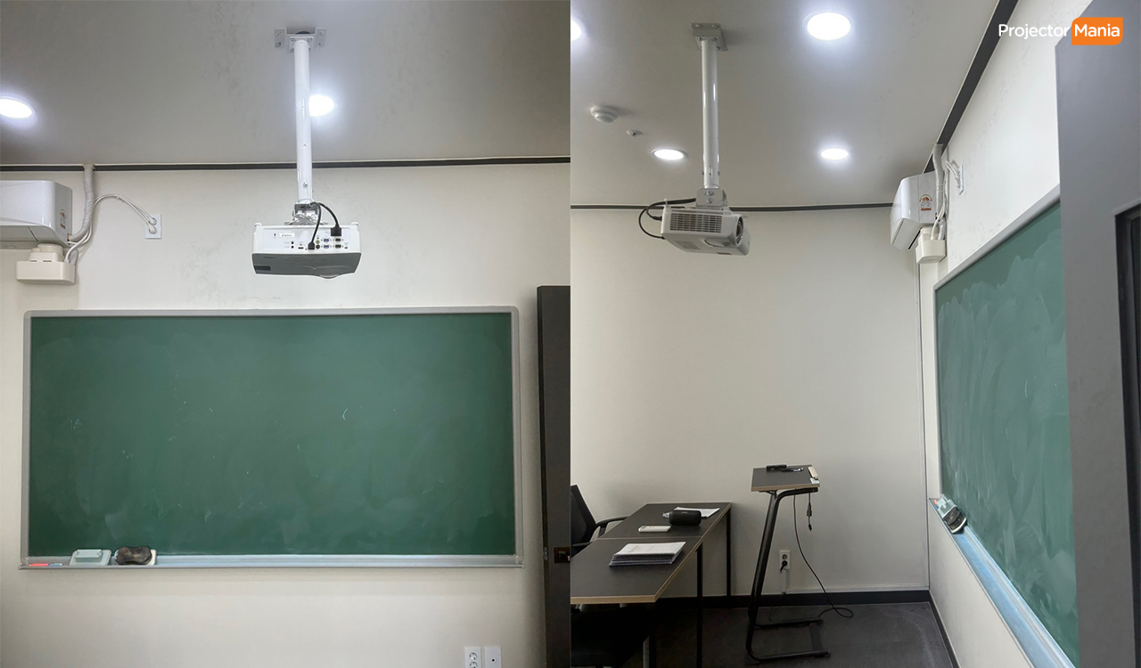 기존에는 단초점 빔프로젝터를 사용 중이었으나, 램프 사용 시간이 모두 소진되어 프로젝터 교체 설치를 요청해 주신 케이스입니다. 특히 이번 현장은 ✔ 단초점이 아닌 일반(장초점) 빔프로젝터를 사용해 보고 싶으셨고 ✔ 조명이 켜진 상태에서도 잘 보이는 고밝기 강의용 프로젝터를 원하셨던 상황이었습니다. ![]()