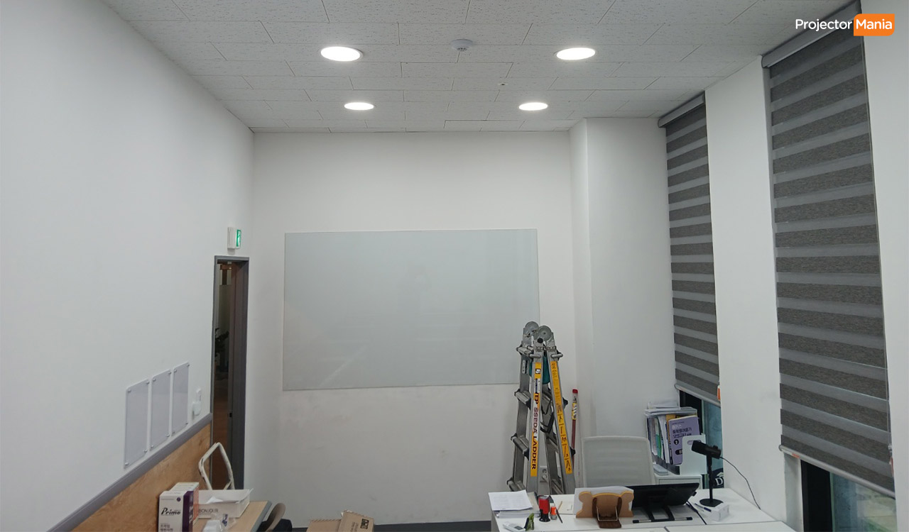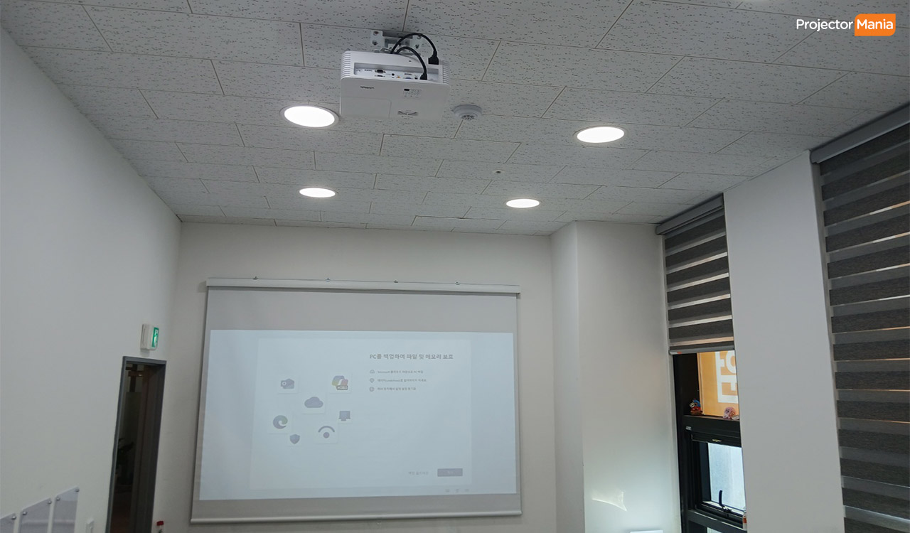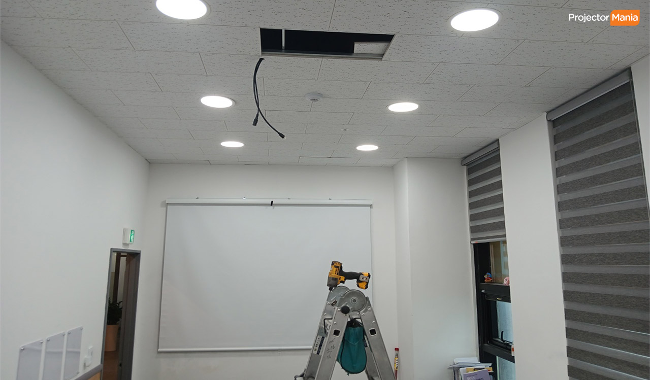 설치 현장 이번 현장은 강의실 중앙 천장에 고정형 브라켓으로 설치했습니다. 텍스 재질이라 천장 안으로 선 매립이 가능했습니다. 비비텍 MW724는 투사거리를 고려해 100인치 스크린 기준 약 2.5~3.6m 사이에 설치 해드렸습니다. 스크린은 별도로 보유하고 있는 제품이 있어서 같이 설치 해드렸습니다. 강의 몰입도를 높여주는 비비텍 MW724 빔프로젝터 ![]()