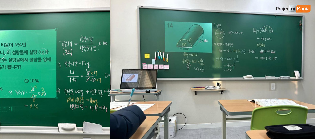 강의실의 구조와 환경이 서로 달랐기 때문에, 각 공간에 맞는 투사 환경과 설치 방식을 꼼꼼히 조정했습니다. 🏫 설치 환경 – 학원 강의실 2곳 비교 세종 학원 : 천정이 높고 / 청칠판에 투사 화면 크기 : 칠판의 전체 보다는 일부 크기로만 투사 원함 세종에 위치한 수학학원은 기존에 비비텍 단초점 모델을 사용 중이셨습니다. 수업 진행에 따라 프로젝터를 칠판에 꽉 채울 것인지 일부를 채울 것인지 선생님과 함께 현장에서 의논 후 설치를 진행 해 드립니다. 이번에도 화면 크기는 칠판에 꽉 채우는 것 보다는 일부만 투사해서 사용할 예정이라고 하셨습니다. ![]() ![]()