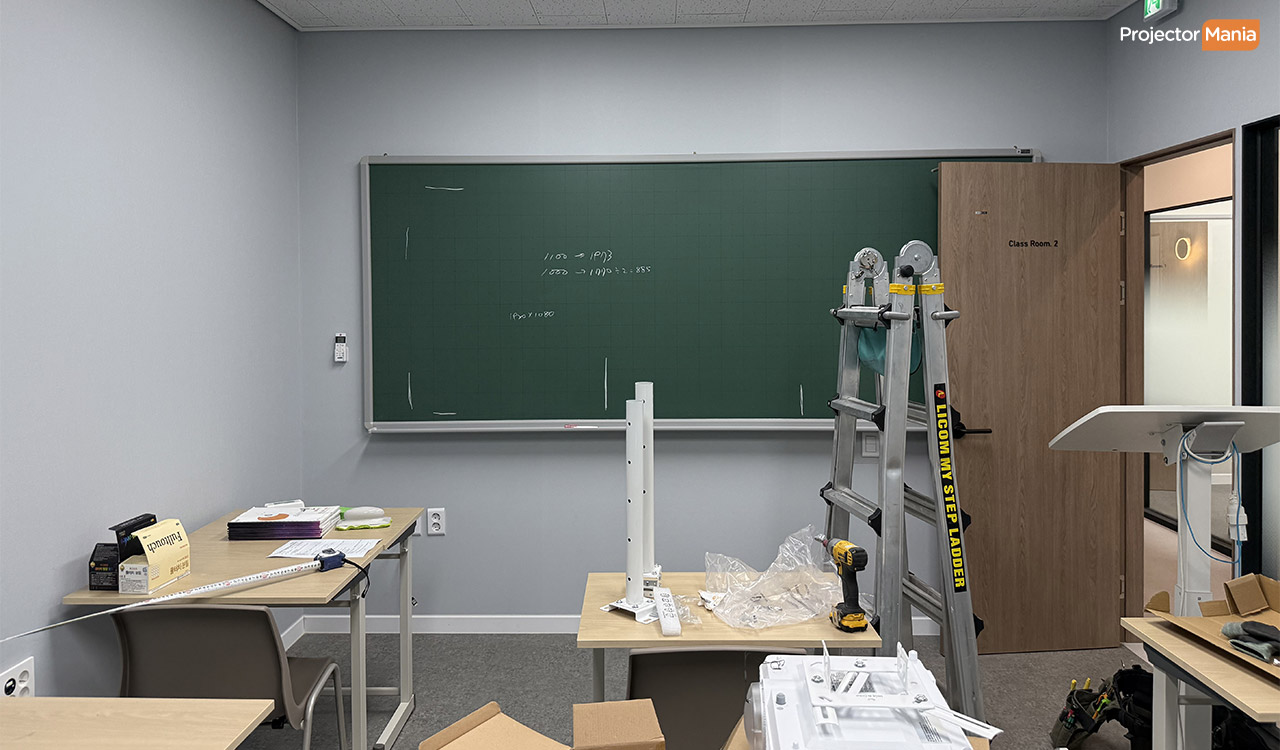 이번에는 두 곳의 학원 강의실에 풀HD 단초점 프로젝터를 설치했어요.