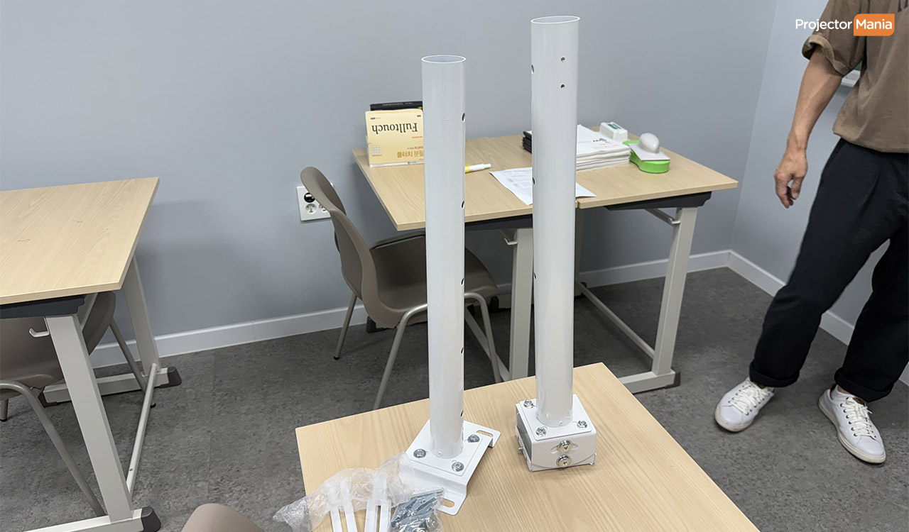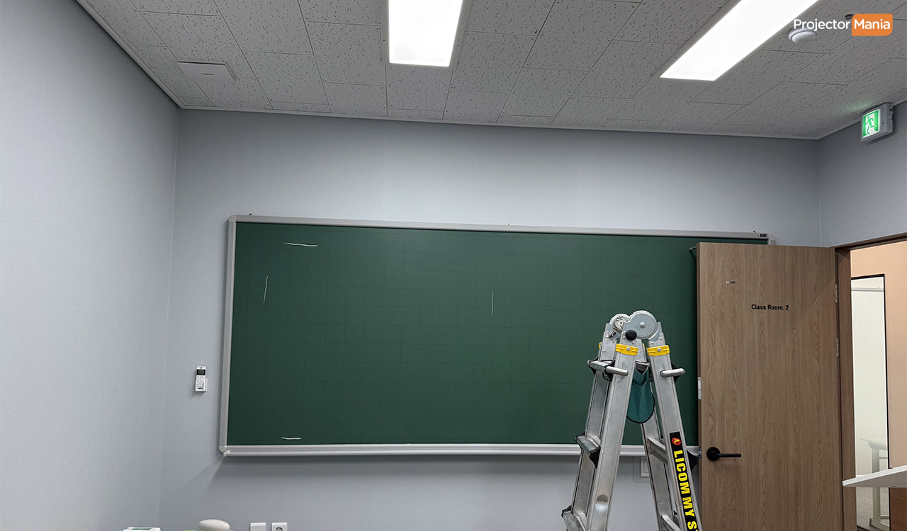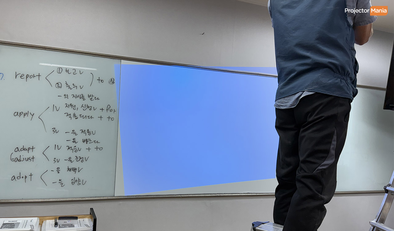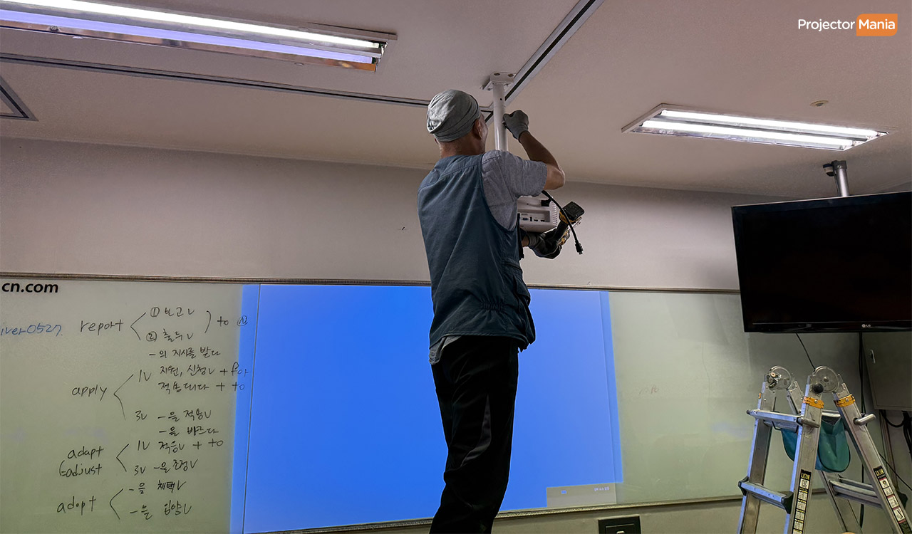 화이트보드 표면은 반사가 심해 화면이 번질 수 있습니다. 그래서 이번 현장에서는 무광 시트지를 부착해 빛 반사를 줄이고, 색 대비를 더욱 또렷하게 구현했습니다. 💬 “무광 처리 덕분에 화면이 훨씬 깔끔해요.” B학원도 천정 높이가 높아 봉 브라켓을 이용해 설치가 되었습니다. ![]()