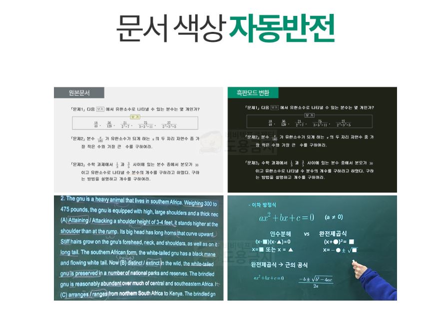 흑판 모드 기능이 탑재되어 있습니다. 흑판 모드는 투사되는 색상을 흑백반전해서 더 선명하게 볼 수 있는 기능입니다. 소스 기기에서 별도 설정 없이 프로젝터>설정>디스플레이 모드에서 변경 가능합니다. ![]()