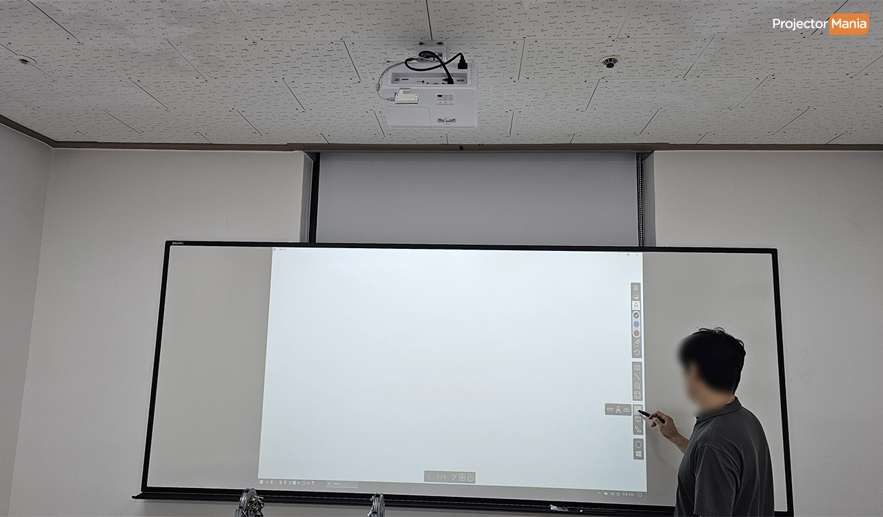 눈부심 방지가 가능한 장점이 있습니다. 설치 환경을 보면 천장이 텍스 재질입니다. 선매립이 가능한 구조로 깔끔하게 선 정리해드렸습니다. 추가로 매직 보드도 같이 설치해 드렸습니다. 매직 보드는 전자칠판을 구현하는 기기입니다. 작은 사이즈로 이동식으로도 간편하고 반응속도도 빨라서 활용도가 높습니다.