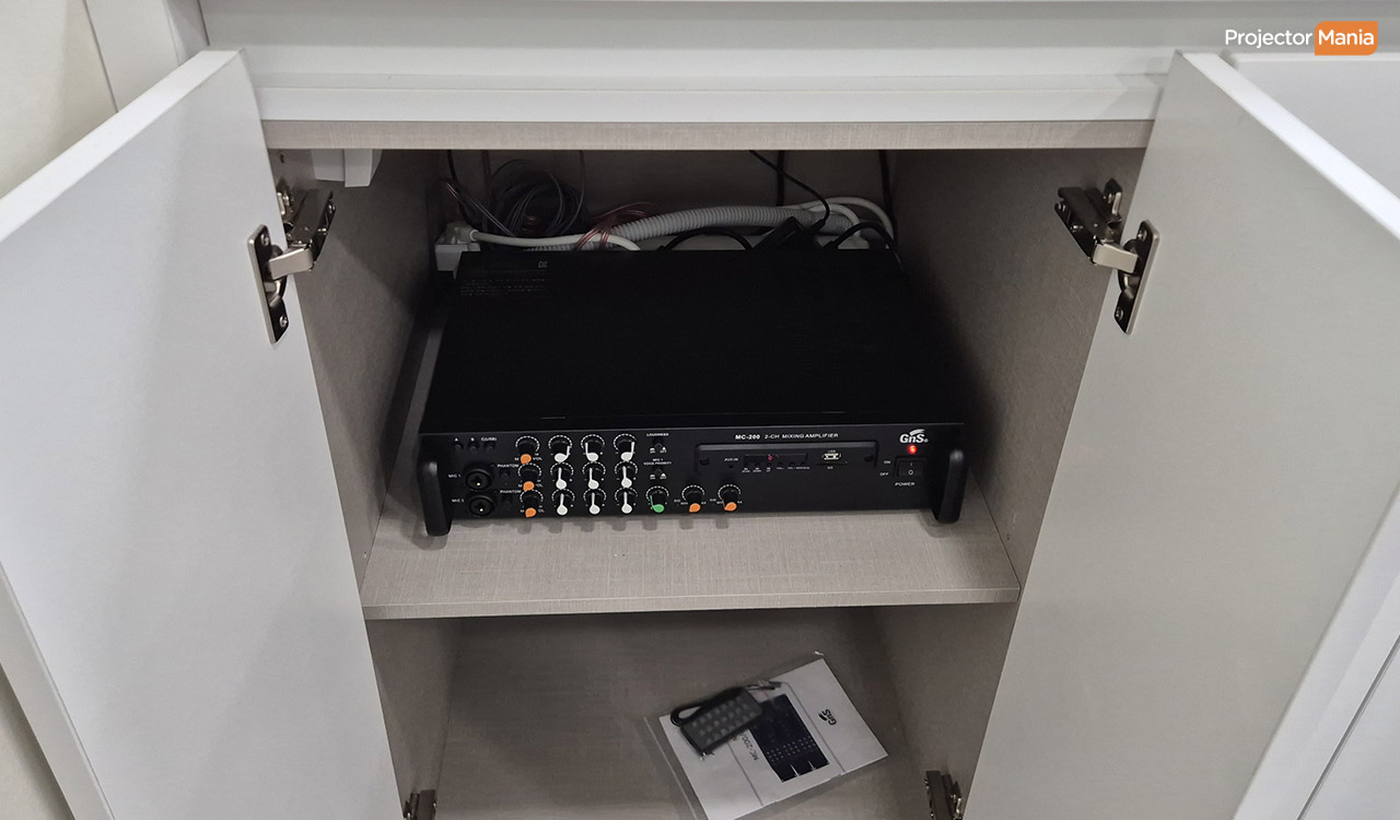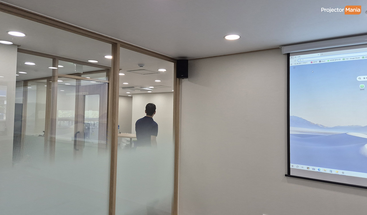 회의실에서 보기 딱 좋은 사이즈입니다. 또한 스피커와 앰프 설치 요청도 주셔서 음향 시스템까지 함께 세팅해드렸습니다. 🎵 ![]()