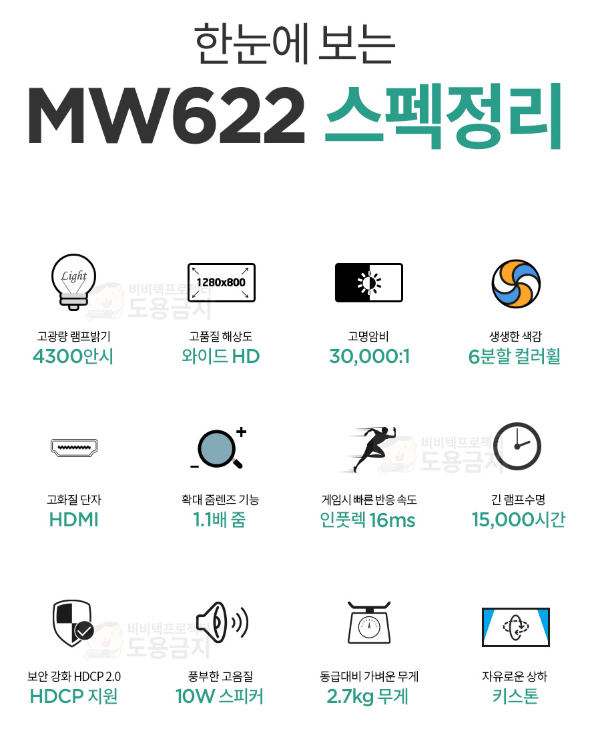MW622은 밝기, 해상도, 명암비 모두 학원 환경에 최적화된 가성비 모델입니다.