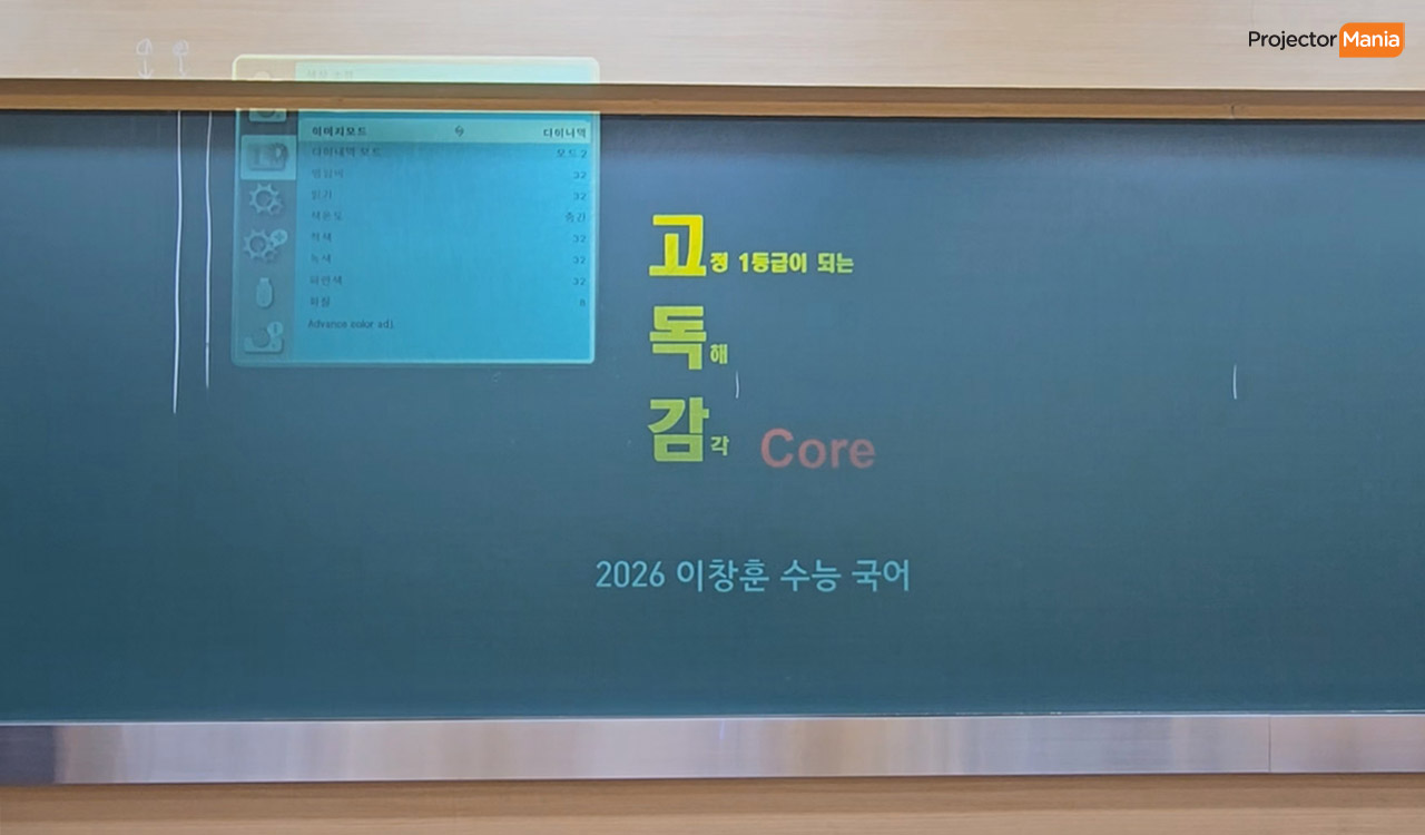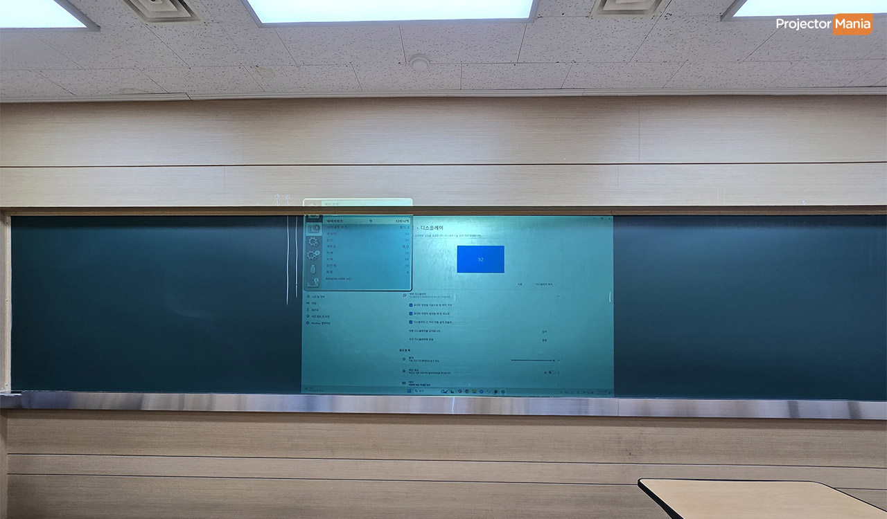 설치된 공간은 강의실 흑칠판 / 청칠판이었고, 칠판 특유의 어두운 배경 위에도 6000안시 밝기 덕분에 선명한 투사가 가능 했습니다. 학생들이 뒷자리에서도 글씨와 자료를 뚜렷하게 볼 수 있었고, 긴 수업 시간에도 밝기 저하 없이 안정적으로 작동 했습니다. 특히 레이저 광원은 램프 교체 부담이 없어서 학원처럼 매일 오랜 시간 사용하는 환경에 매우 적합 했습니다. ![]()
