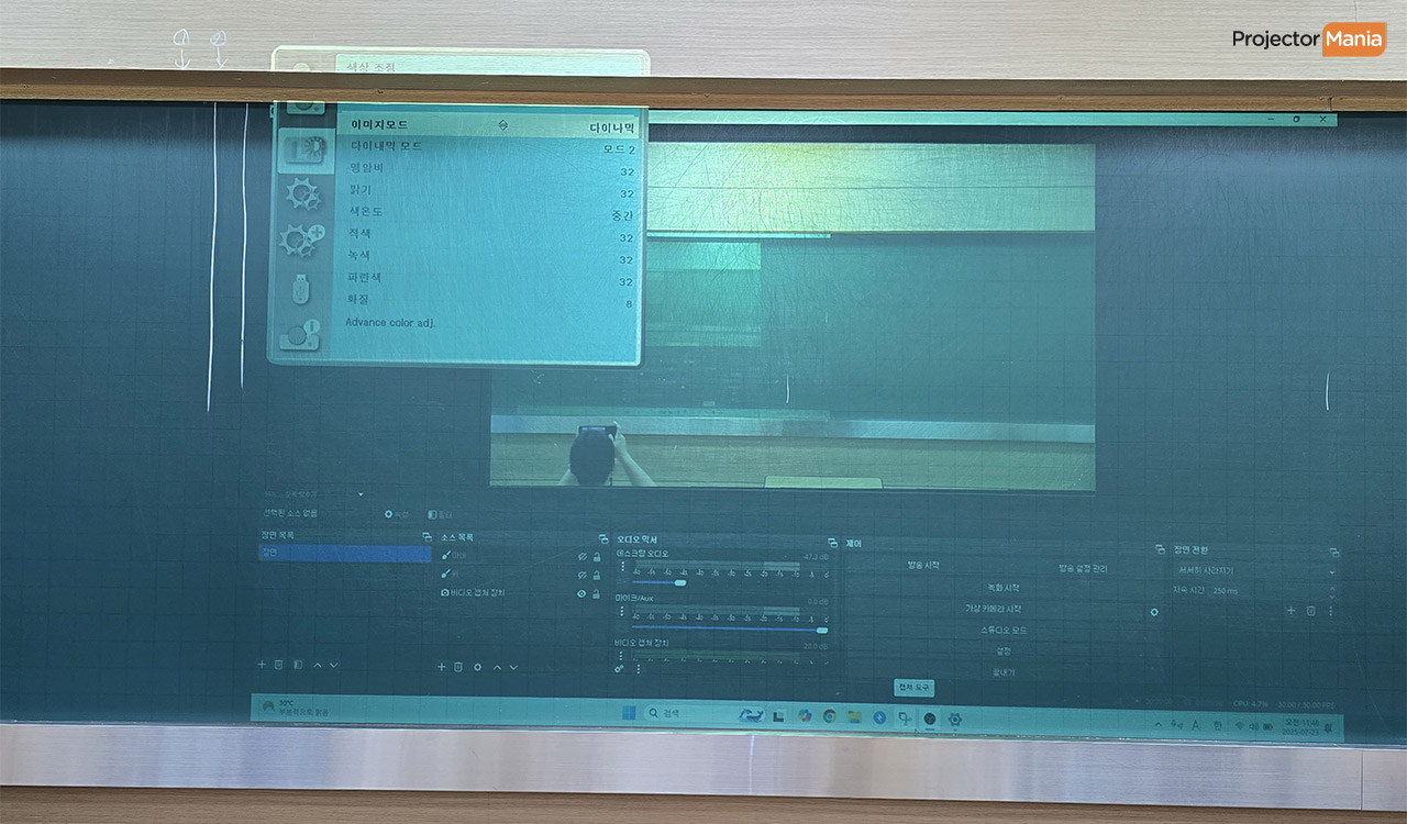 설치 완료 후 , 실제 수업 자료와 영상을 투사하여 테스트를 진행 했습니다. ☞ 흑칠판 위에서도 선명한 가시성 확보 ☞ 밝은 조명 환경에서도 또렷한 화면 유지 ☞ 강의용 문서 , 도표 , 글씨 표현 최적화 강사분께서도 뒷자리 학생들도 잘 보인다! 며 만족해 하셨습니다.