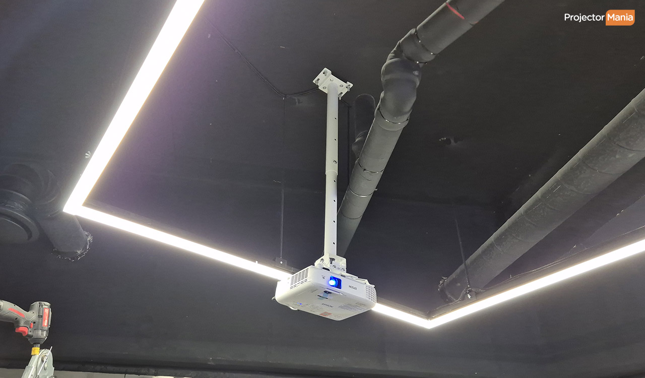 천고가 높은 오픈 천정이라 일반 브라켓 설치가 불가능 봉 브라켓을 사용해 스크린 높이에 맞춰 설치 케이블 노출은 최소화 하고, 이용자 동선을 고려해 정리 ![]()