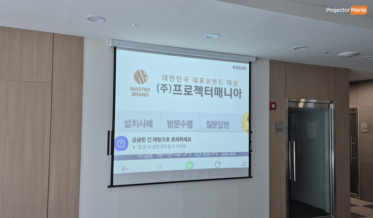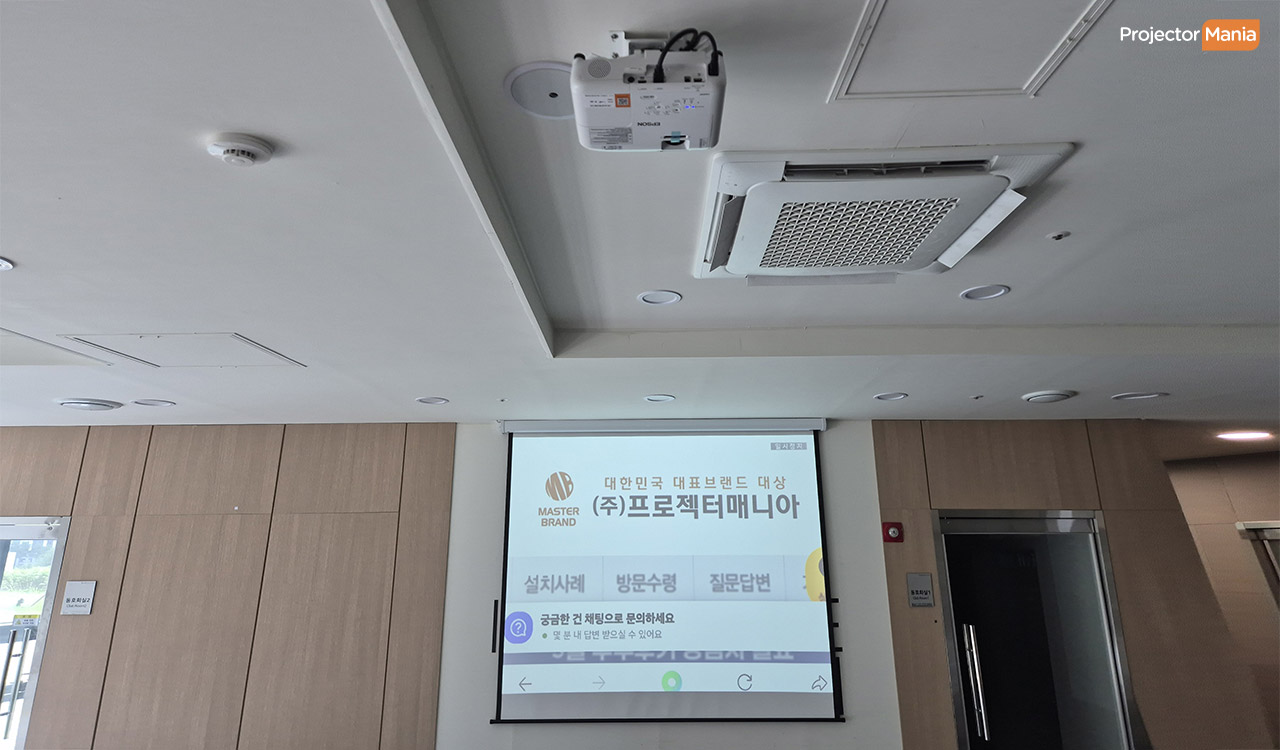 비교적 낮은 천정 -> 전동 스크린과 빔프로젝터를 깔끔하게 벽면에 설치 입주자 대표회의 , 직원 교육 , 안내 영상 상영 활용 목적 두 공간 모두 "깔끔한 시공" 과 "밝은 공간에서도 잘 보이는 프로젝터" 를 원하셨습니다. ![]()