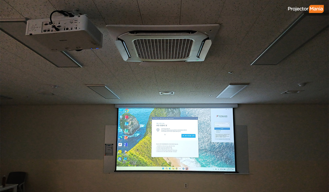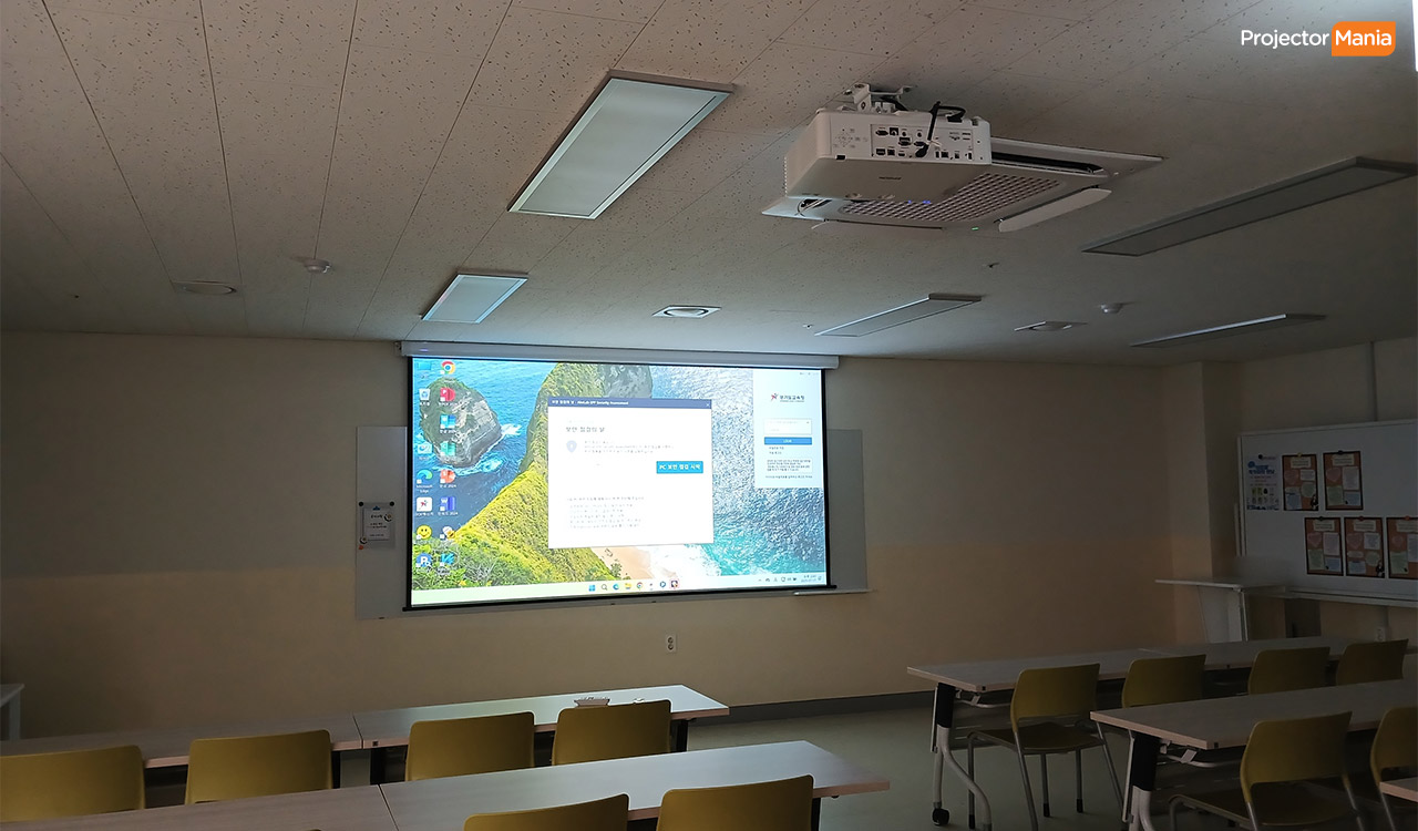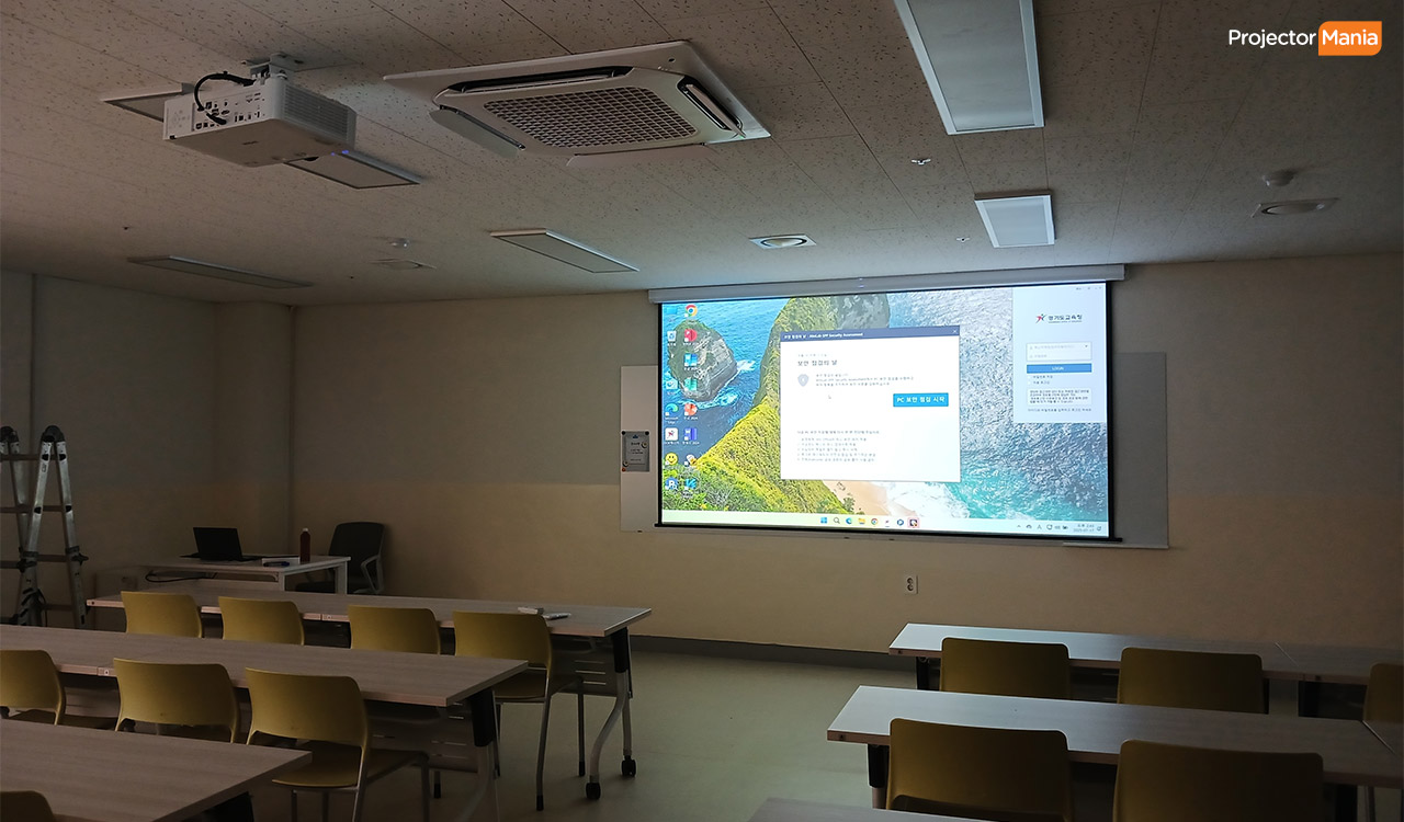 어떤 게 있을까? 학교의 경우 정해져 있는 예산으로 오래 사용할 수 있고 내구성이 좋은 프로젝터를 주로 찾고 있습니다. 보통 작지 않은 공간으로 5천안시 이상, 선명한 화질을 위한 풀 HD 이상 으로 사용하고 있습니다. 고객님께서는 1.5칸 정도 되는 교실로 제품 추천을 드려서 설치 진행하게 되었습니다. ![]()
