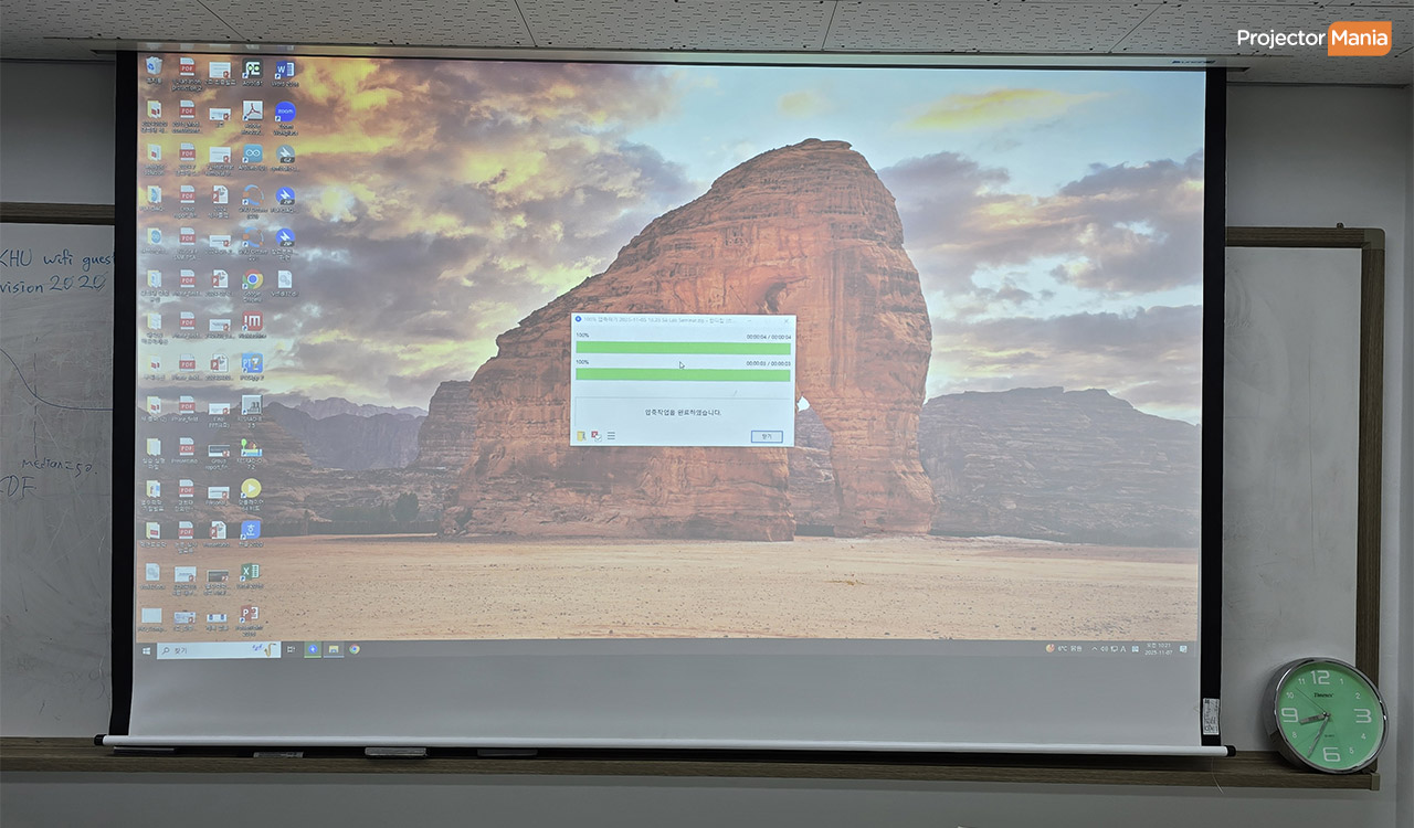 설치 후 바로 강의 자료를 띄워 테스트한 결과, “글씨가 훨씬 선명하다” “조명 켜도 화면이 잘 보인다” “강의 자료 전달이 훨씬 수월해졌다” 라는 긍정적인 반응을 주셨습니다. 특히 국제캠퍼스 강의실처럼 학생 수가 많고 공간이 넓은 환경에서는 5000안시 WUXGA 프로젝터 선택이 매우 중요하다는 점을 다시 한번 확인할 수 있는 설치 사례였습니다.