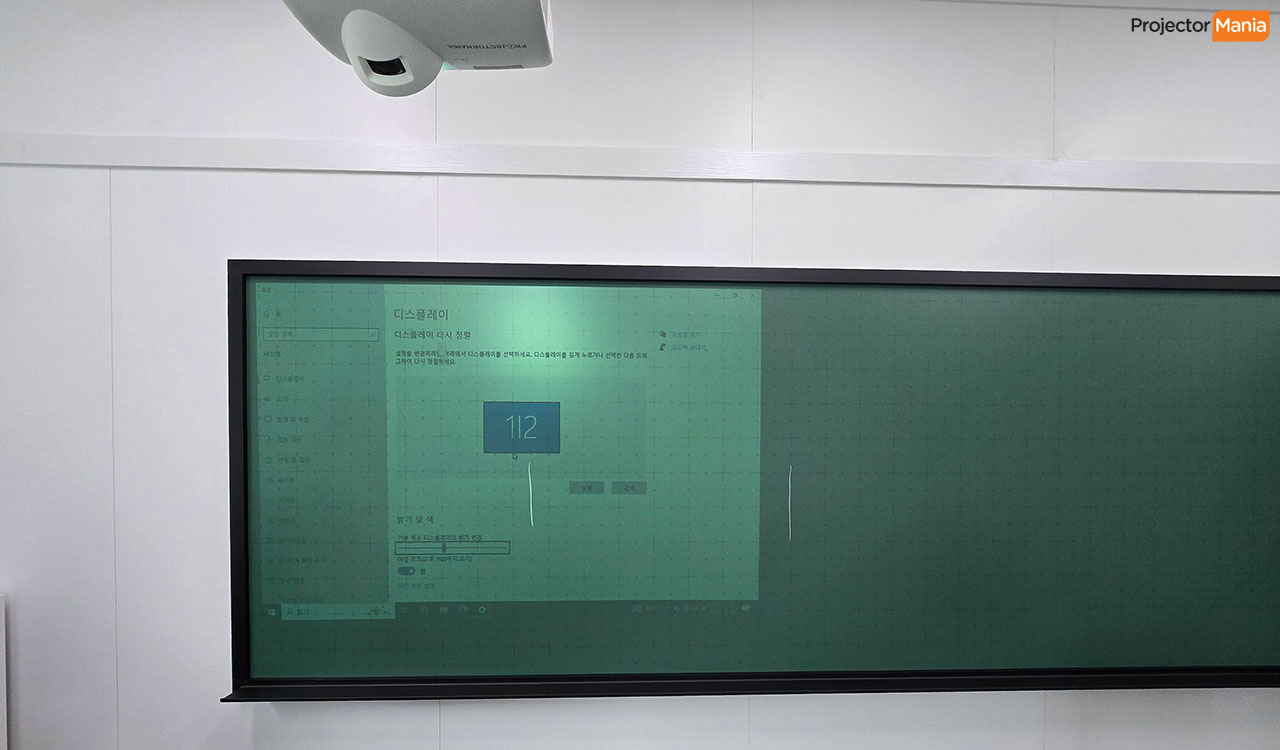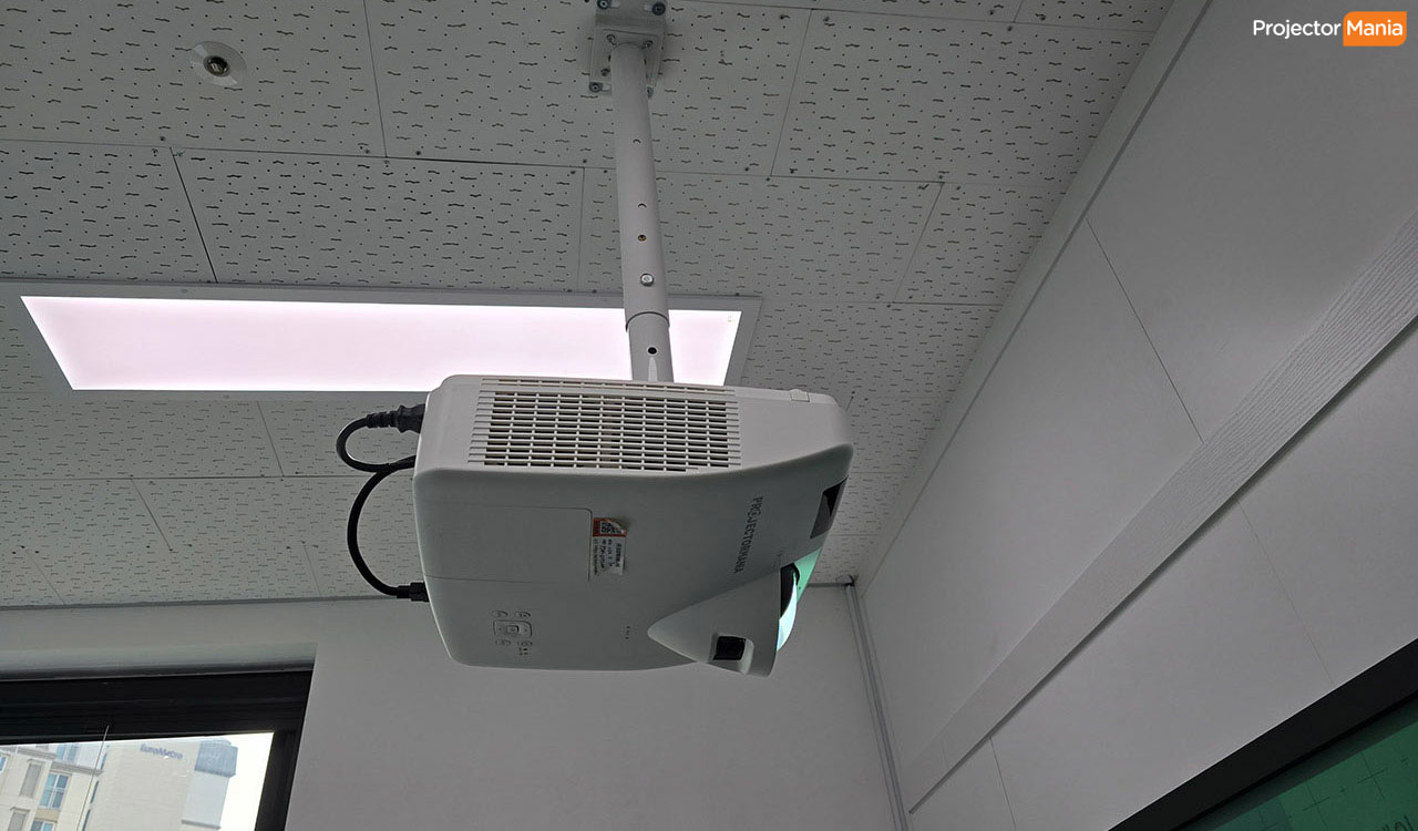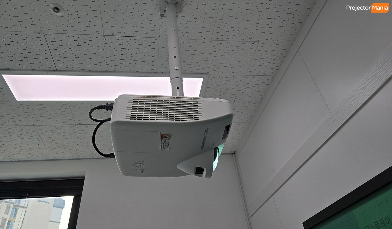 학원은 인테리어와 동선도 중요합니다. 단초점 프로젝터는 보통 ✔ 칠판 바로 앞 ✔ 짧은 봉 브라켓 또는 천장 밀착 설치 가 가능해 배선이 깔끔하고, 학생들이 고개를 들고 시야를 방해받을 일도 적습니다. 프로젝터 투사를 통한 판서 수업 시 단초점 프로젝터의 장점이 더욱 살아납니다. ![]()