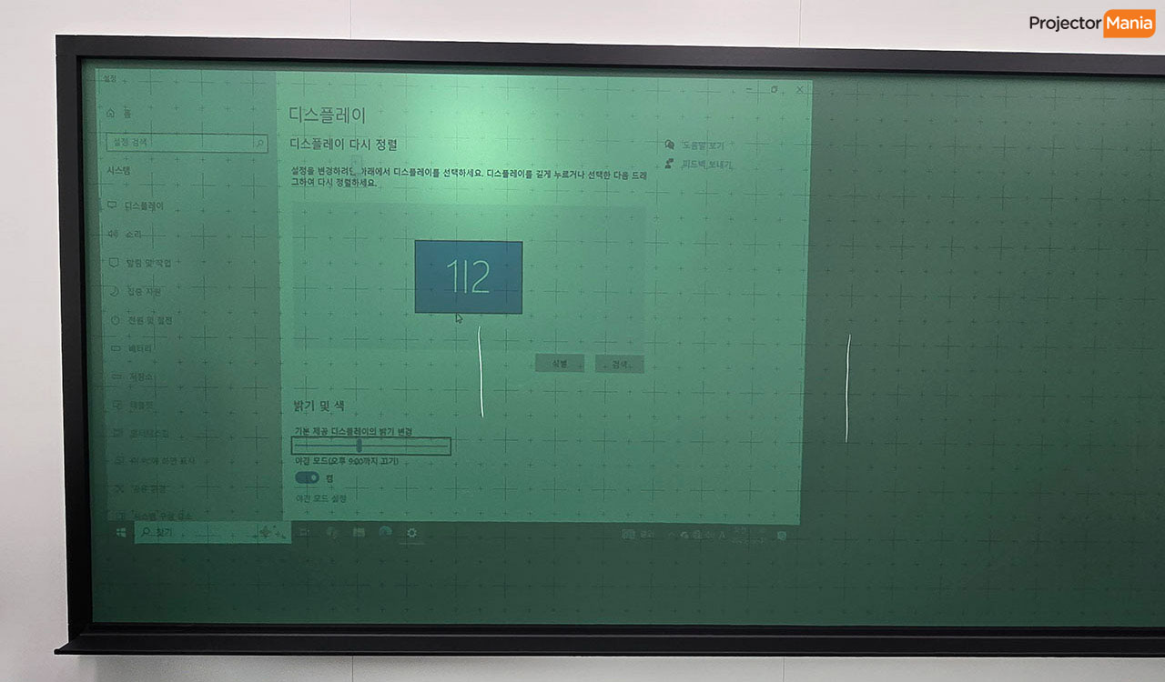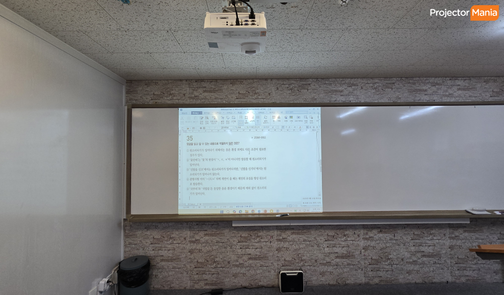 강사 그림자 걱정 없는 수업 환경 학원 강의실은 구조상 ✔ 강사가 칠판 앞에 서서 설명하고 ✔ 화면 앞을 오가며 판서하는 경우가 대부분입니다. 일반 프로젝터의 경우 투사거리가 길어 강사가 화면 앞에 서면 그림자 가림 현상이 자주 발생합니다. 반면 단초점 프로젝터는 ✔ 칠판 또는 스크린과 매우 가까운 거리에서 투사 ✔ 강사가 화면 앞에 서도 그림자 최소화 실제 설치 후 강사분들이 “설명할 때 화면 가릴 일이 없어 수업 흐름이 좋아졌다” 라고 말씀하시는 경우가 많습니다. ![]()